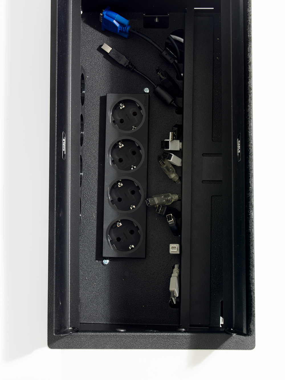 Cable Support Conference leveres med 8 stikkontakter, (4 + 4) og med 5m tilførselskabel, 14 ferdige kabelspor med kabellås, gjør det mulig å tilføre forskjellige typer kabler som f.eks. Patchekabler, HDMI, VGA, minijack (lyd), DVI, eller andre ønskede kabler. Med denne løsning kan brukerne enkelt tilføre kabler selv samtidig som kabellåsen sikrer og sorterer kablene. Produktet kan også seriekobles (strøm) ved større installasjoner. Alt dette gjør at produktet hele tiden er klargjort for nye kabler og på den måten fornye seg etter endrede behov. Overskytende kabler samles opp i kabelposen under.