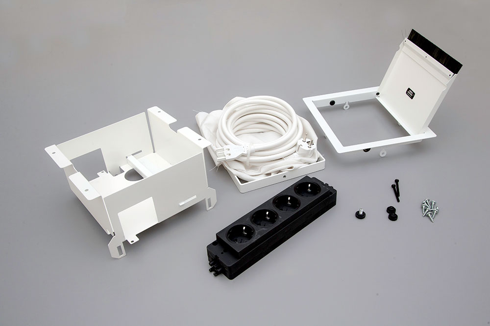 Pakken inneholder: 1 stk. Cable Support underdel m/pose | 1 stk. lokk | 4 x strøm, 5 m tilførselskabel og utskjærings mal. Monteringsanvisning ligger også ved.